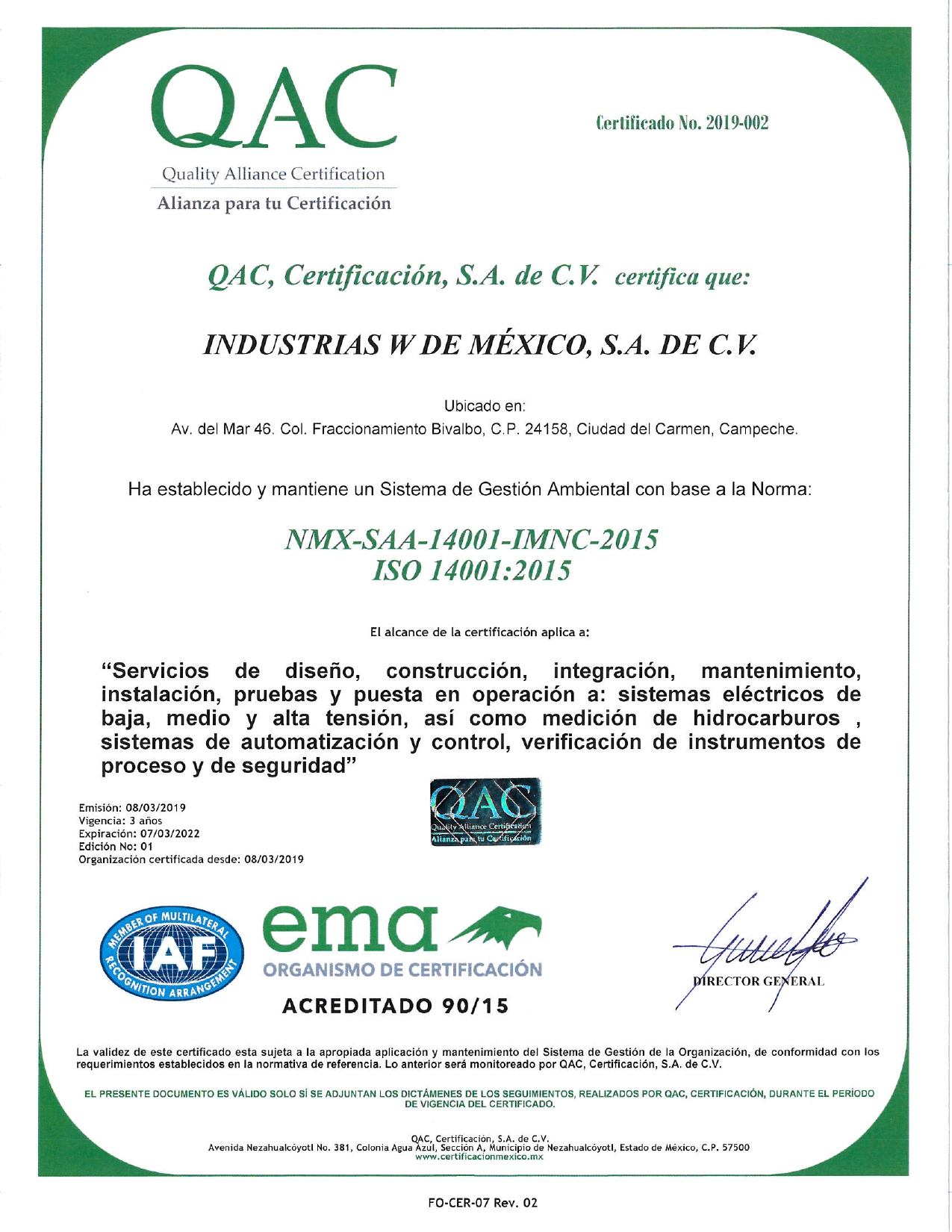 Certificación de la norma de sistema de gestión ambiental - ISO 14001.